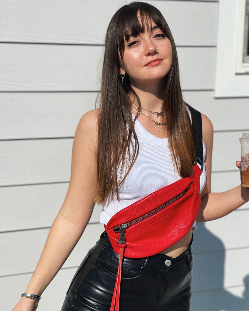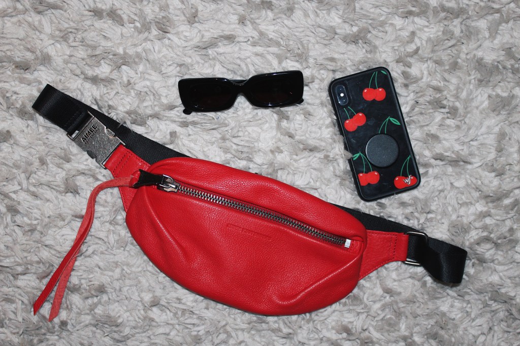 I’ve been asked how to put together outfits before. My habit is to choose one piece you feel like wearing and styling around that focal point. Today, my focal point was my favorite statement bag, given to me by one of my best friends Jessi. The fanny pack is by Aimee Kestenberg and I wear it either across my body or on my shoulder. Since it’s a rich red, I’d stick to white or black for tops. I kept it simple with a white crop tank. These vegan leather pants are the Melina pant from Aritzia and they are worth. Every. Penny. They’re surprisingly comfortable which makes them a perfect substitute for jeans. As usual, I love Dr. Martens, and I especially adore these platform sandals. They’re my go-to because they’re edgy, give me a boost, and I could walk forever in them. This exact style is pretty much sold out, but there’s still some left in this style. I finished off the look with this pair of sunnies by CRAP Eyewear, another gift from a bff: Nichole (seriously, my friends are the best.) Of course, it’s always a plus when your phone case happens to match🍒