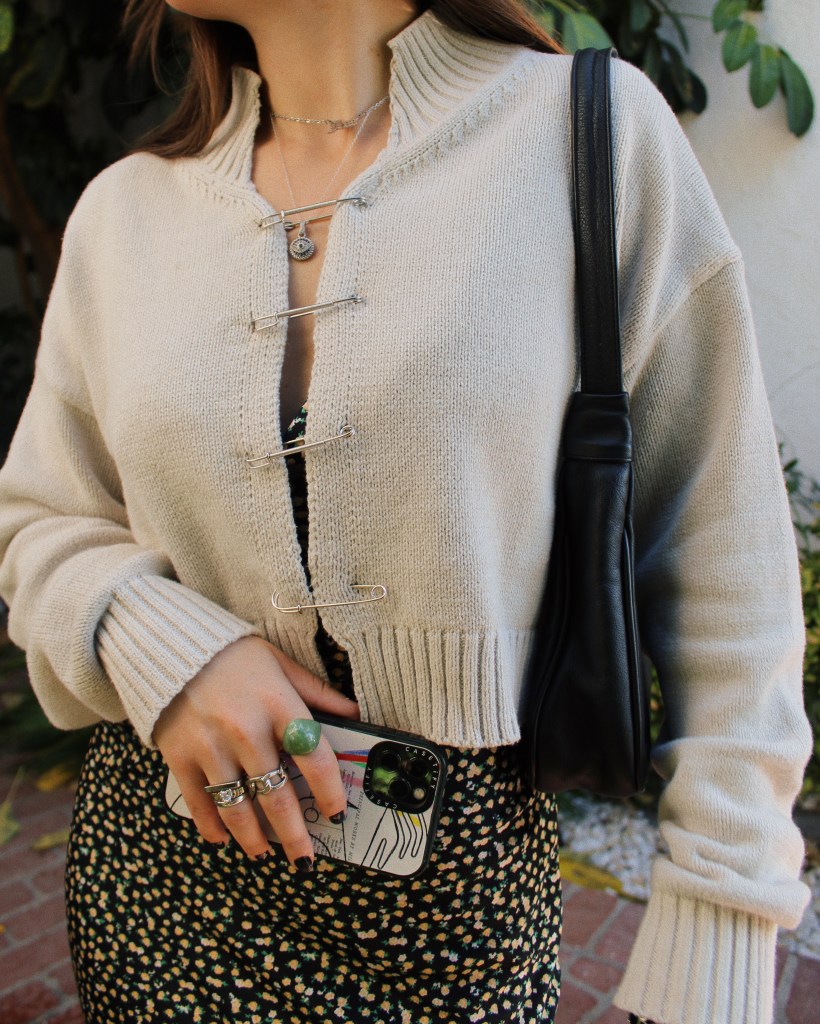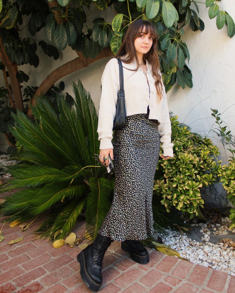 Would it really be a blog post of mine if I didn’t feature at least one pair of platform docs? Some things will never change. This particular pair was a collaboration with a brand from a few years ago, but any tall platform boot will give you a similar look. The dress itself is from Soto Boutique during this past summer. On top I threw on this safety pin sweater that is currently available at Soto Lifestyle- and selling out. Run don’t walk. It’s the perfect weight for fall in LA and the unique detail is definitely a plus. The easiest way to decide what color to wear over a printed dress is to pull any color out of the print. For these three looks, I loved playing with beige on top, but I’ve also styled it with black, green, ivory, or even a pop of red. Especially when the print is mostly neutral, you can’t go wrong. I kept it simple and small for the bag since my shoes are so big. This look is so ME. Recreating this one ASAP.