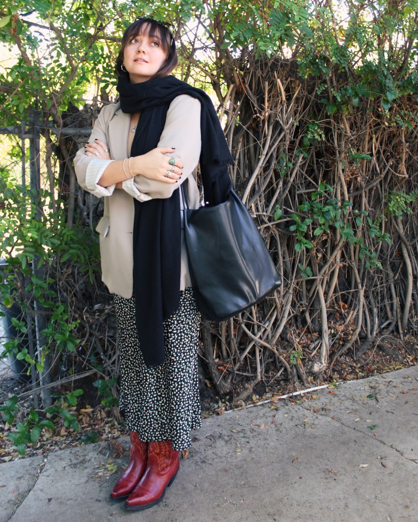Sometimes, I just want to feel like a pile of clothes. This look made me feel so cool, comfy and chic. I threw on a beige oversized blazer and a wrap scarf, which always makes me feel way more put together than I am. I kept the work tote because I’m a working gal, and I like how this bag is a little more structured than a trendy canvas tote I’m seeing all over Pinterest. The proportions of this outfit call for an equally huge bag, or a smaller structured handbag. I loved this look but genuinely can’t pick a favorite of the three.