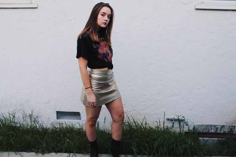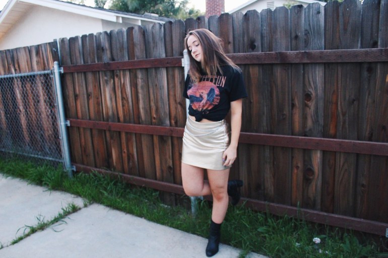 Lately, I’ve been loving the look of mixing metals. One easy way to do so is to mix it up with jewelry like wearing rings or necklaces of different finishes together. I decided to achieve the look differently by layering a silver chain belt over a metallic gold skirt. I love the edge and shape it gives to my lower half, and decided to keep it casual with a Led Zeppelin t-shirt and ankle boots. I think a good way to approach a piece that seems daring to you is to try to “play it down” with casual pairings. I tied the top to give myself more shape and added a bronzed metallic lip. I love this look, especially how the silver chain looks against the gold. Let me know what you think of this look! As I type this, I am currently in Kauai, so my next post will be a compilation of some outfits from my trip! Thank you so much for checking out my blog, and please feel free to like and share!