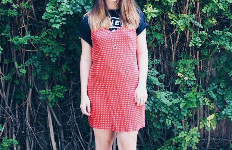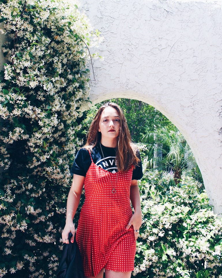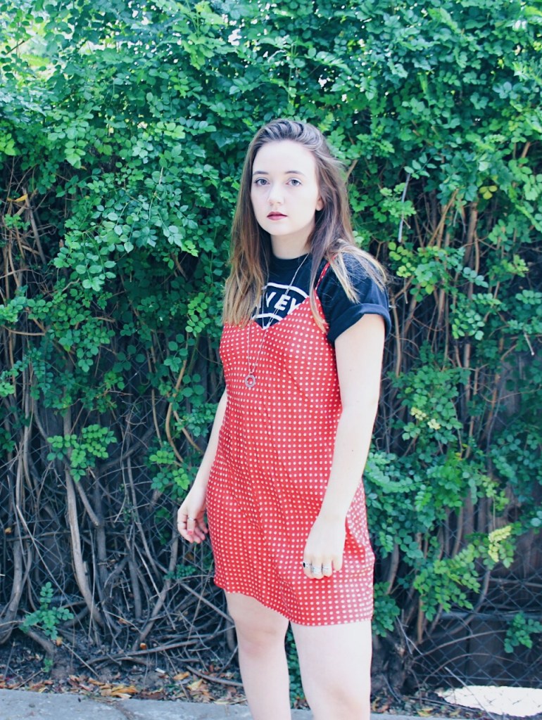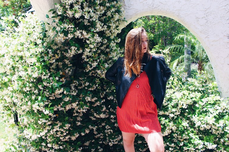 Happy Friday! Today I bring you a look centered around this dress that I found on the Depop shop @ashleighcherie. I wanted to do a look based around reusing pieces through thrifting, online shops like Depop or Poshmark, or revamping pieces from your own wardrobe. This specific piece is a red slip dress with white polka dots. My motive for purchasing this was to wear it over a band tee. This is one of my brother’s shirts. My tips for layering a dress over a band tee is to choose a simple, loose silhouette for the dress, and to choose a band tee with a large front graphic with colors that are complimentary of the dress. Roll up the sleeves for a more flattering fit. I threw on some heeled booties to give me some height and a leather jacket for some edge. You don’t always need brand new pieces at new prices to create new styles. I’m trying to practice this as much as I preach it!