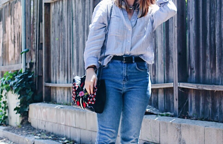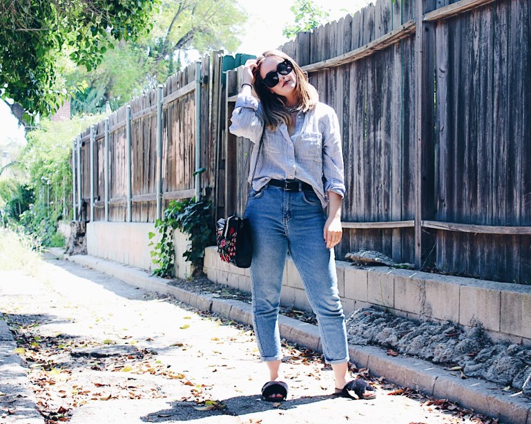 Button down shirts have been a recent obsession of mine, as I can dress them up or down while feeling put together doing either. Lately, an oversized button down shirt with high-waisted jeans and a statement necklace has been my go-to. This top is from Madewell and includes a really cute tie detail in the back. Ideally, I would pair this top with ripped jeans to add some edge, but I kept it simple so I could experiment with accessories. To dress this look down, I threw on some furry slides. When selling these at work, customers always ask, “You wear these outside of the house?” Yes! These have been in style for a while and I don’t see them going anywhere. They add an “off-duy” feel to any look! This is a kind of look that makes these slides more acceptable looking in public. Of course, I had to include my everyday handbag, which is still my favorite fashion piece I own right now. A close second, however, is this incredible statement necklace from Free People. Shout out to my friends for making me spend money on this because it truly is me in necklace form. The combination of all these pieces creates a “girl boss” feel that is addicting. This entire look makes me feel cool and confident, which is what fashion should do!
