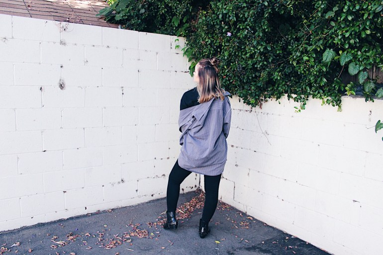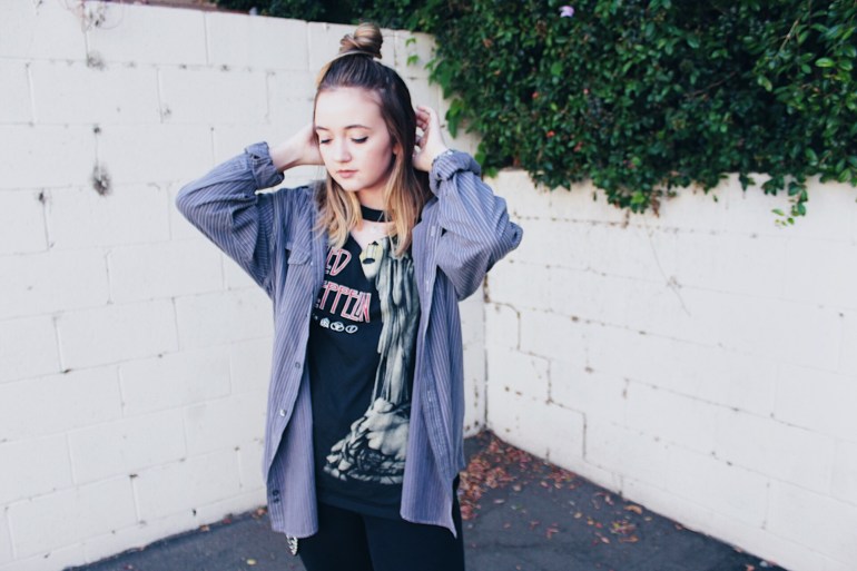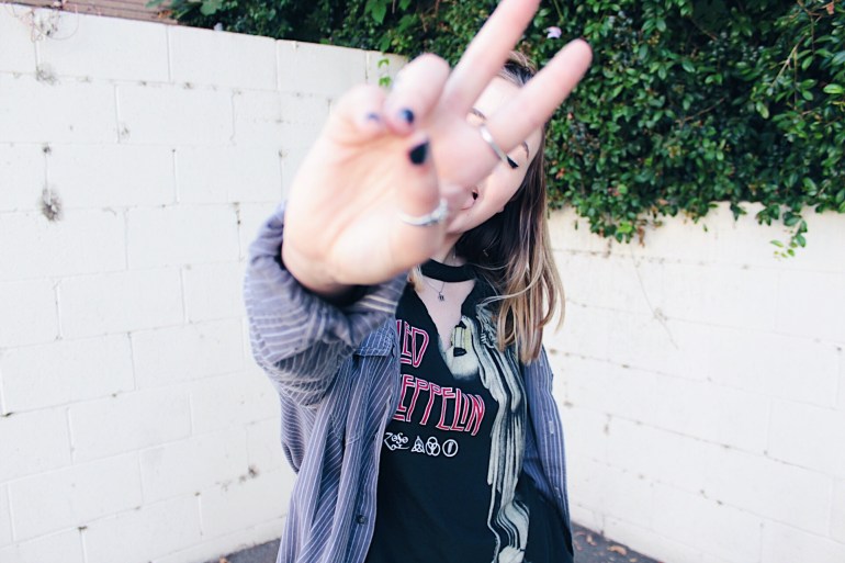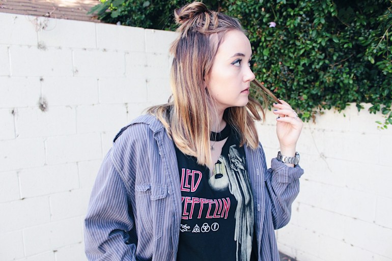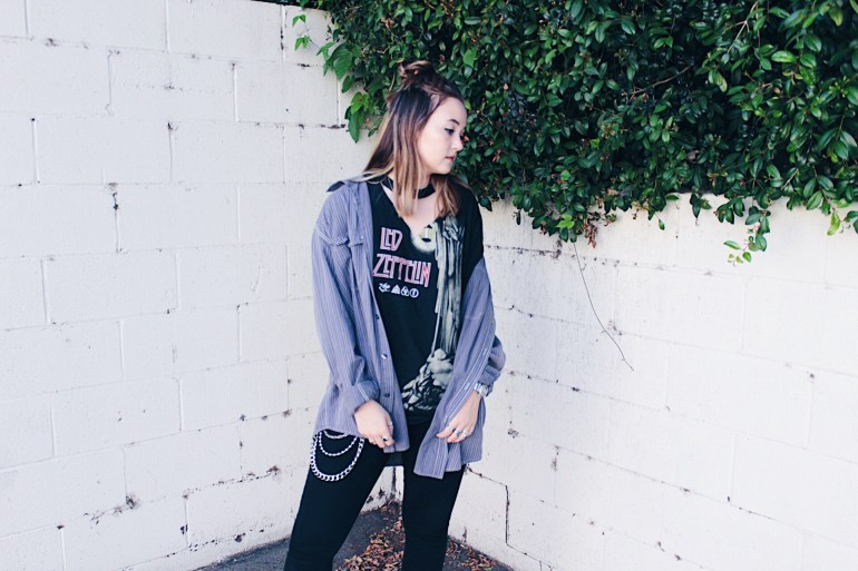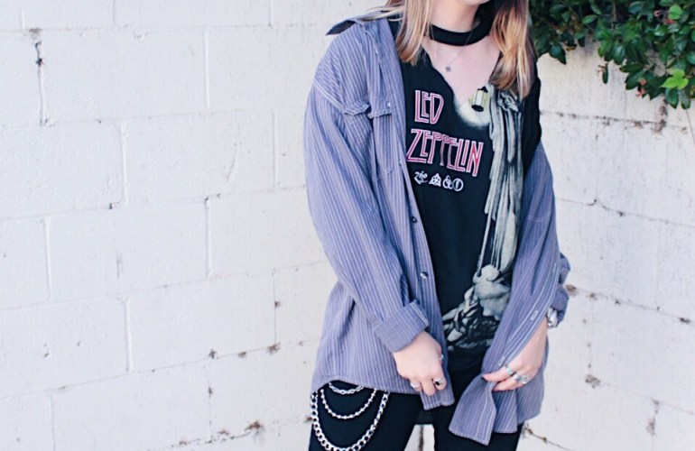I love cutting T-shirts, and one of my favorite trends that I still wear to death is the “faux choker” in tops. This is such a fun way to showcase a necklace or a bralette, even though I went edgier in this look. I added this Zeppelin shirt from Target to my collection, and I decided to size up and cut it. I thrifted this button-down awhile ago, but I rekindled my love for it and have worn it a lot lately. Again, it looks great if it’s loosely buttoned to show off a bralette. Can you tell I love bralettes? These jeans are the most comfortable skinny jeans from American Eagle, and the chain is from Urban Outfitters. The chained boots add a roughness to the look. Let me know if you would like a post about how to cut shirts a few different ways! I’ve been cutting shirts for friends for years, so if you are interested, leave me a comment! Thank you so much for checking out my blog!