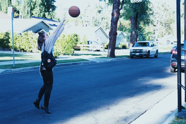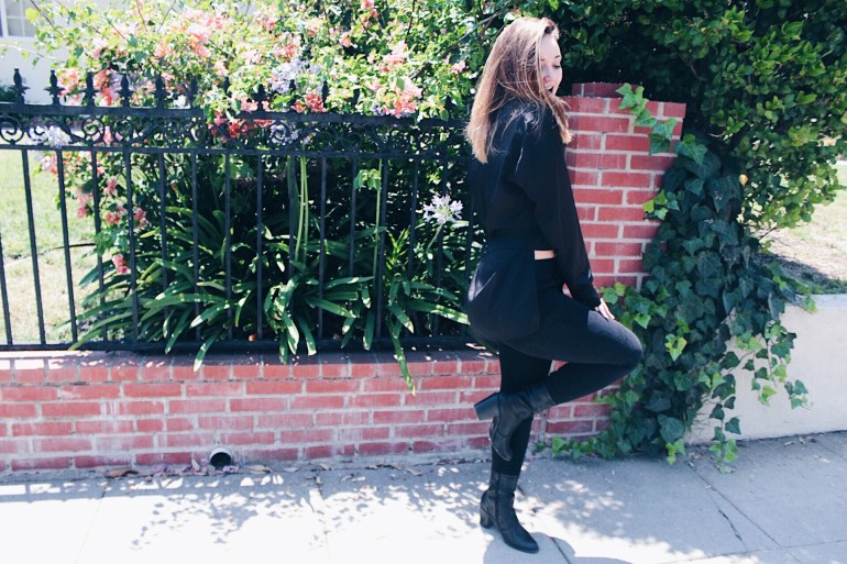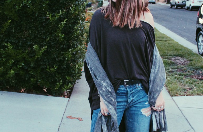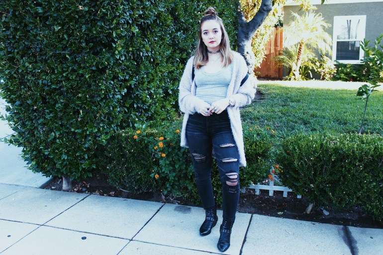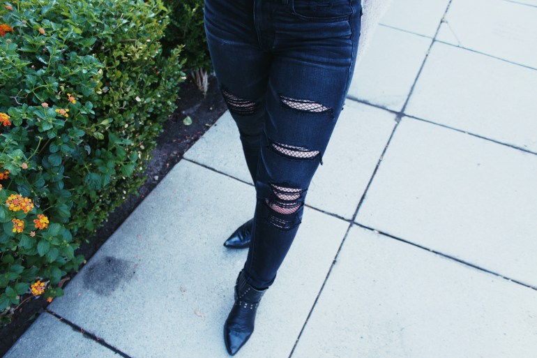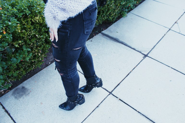 The first look is my perfect mix of girly and edgy, since I countered the black ripped jeans with a pale pink cozy cardigan. I threw on some fishnets under the jeans, but they look great without them too! These jeans are from American Eagle, and fortunately, I’ve been converted. They have easily the most comfortable, high quality jeans and offer a wide variety of styles and lengths. This look could also be cool with a graphic muscle tank instead. I finished it off with a low, comfortable bootie.