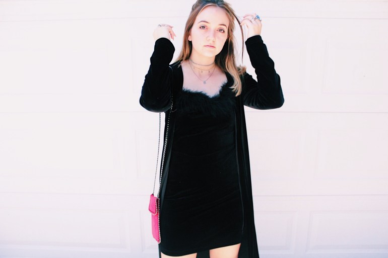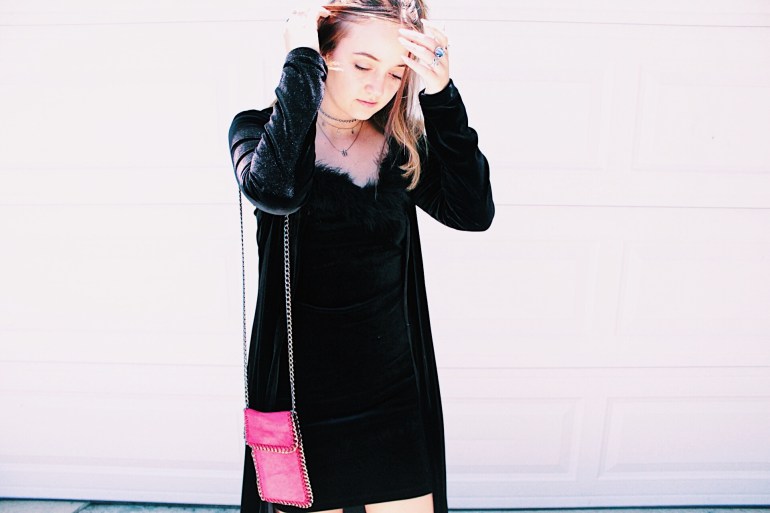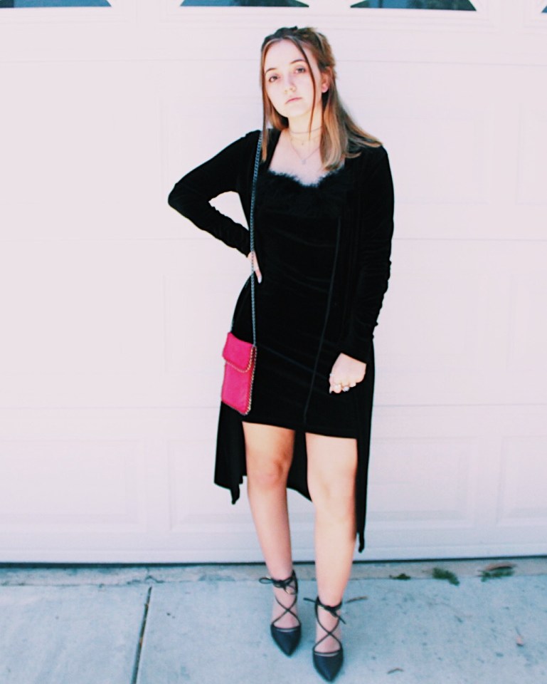 This look made me feel like I belonged in Clueless. This is one of my favorite looks in a long time. It’s girly and sassy, but black, so it’s perfect. Topped it off with a messy half bun and my usual jewelry. I added a pop of color with my phonecase/ purse.