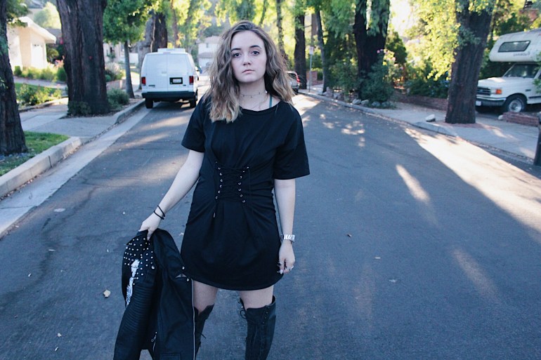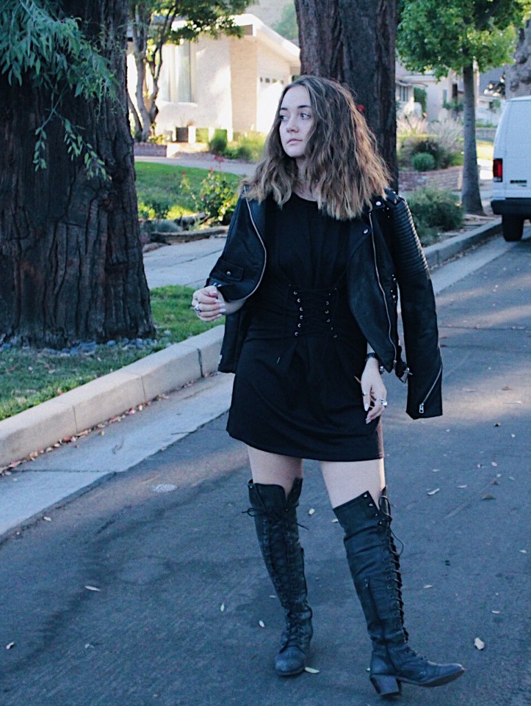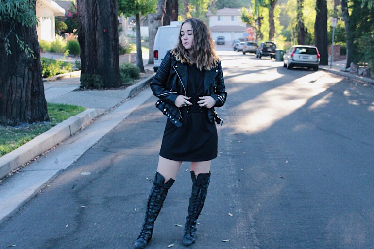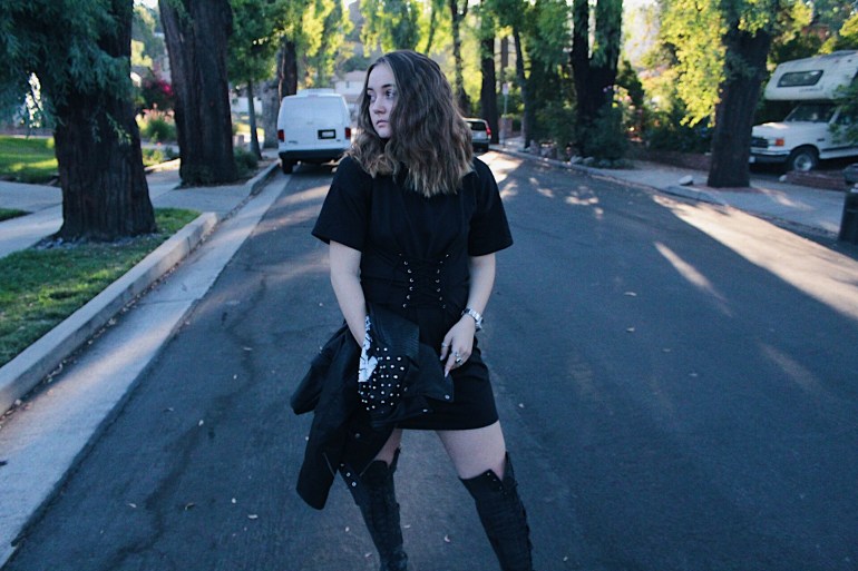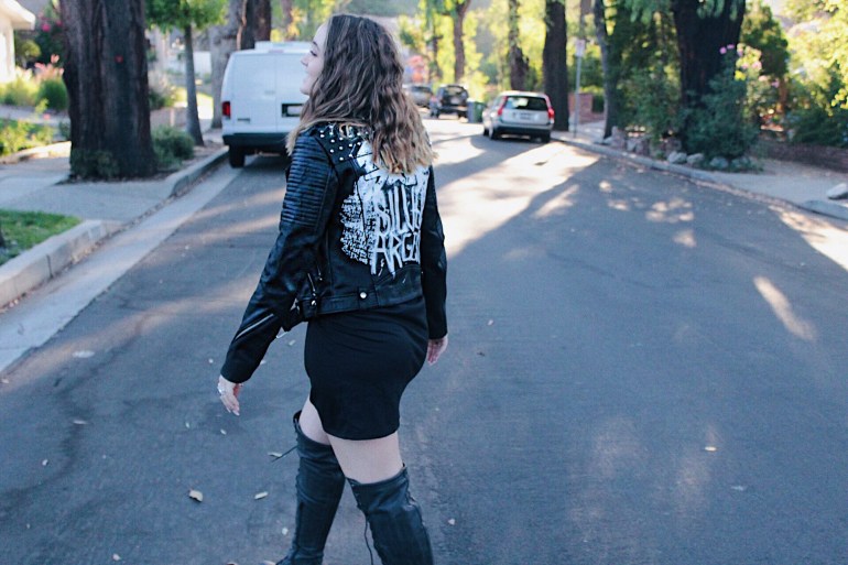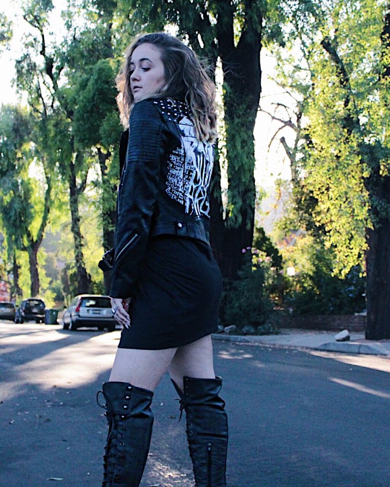 The dress mimics the trendy corset belt style that has been all over instagram. While I don’t prefer the belt trend, I love that this dress incorporates the same idea with the subtle lace-up detail to add shape to a casual T-shirt dress. I threw on one of my current obsessions: this jacket from Zara. It is pure perfection from the studs to the graffiti to the fit. These boots also seem way too warm for the current LA summer, but for a night out with a dress, they add a perfect amount of warmth. The small heel creates height and sound to add confidence while remaining comfortable. They are such a great transitional piece, as they are amazing over skinny jeans as well. To finish off the look, I left my hair in its post-braids shambles and kept my makeup very light, emphasis on the brows. I love this look and I hope you did too!