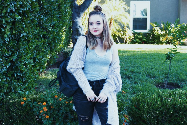The last outfit is a bit girly for me, but I still love this look when I feel like being a little dressy for class. I usually like to throw in a look like this for back to school because in college I have been giving a lot of presentations. On those occasions, I usually wear a dress, or non-ripped jeans with a cool, button up top. This dress is from Forever 21 ( a long time ago) and the cardigan is my boyfriend’s from Tahari. This combination is very easy to recreate, though. The boots are Free People x Jeffery Campbell and they are some of my favorite shoes right now!