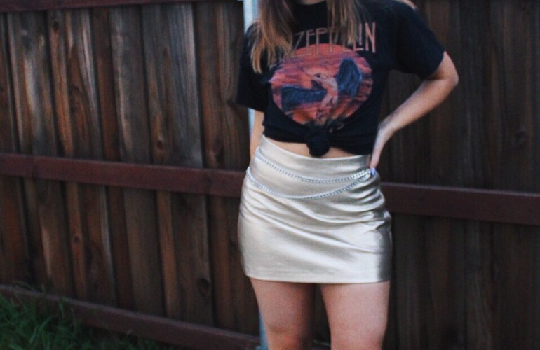 Lately, I’ve been loving the look of mixing metals. One easy way to do so is to mix it up with jewelry like wearing rings or necklaces of different finishes together. I decided to achieve the look differently by layering a silver chain belt over a metallic gold skirt. I love the edge and shape it gives to my lower half, and decided to keep it casual with a Led Zeppelin t-shirt and ankle boots. I think a good way to approach a piece that seems daring to you is to try to “play it down” with casual pairings. I tied the top to give myself more shape and added a bronzed metallic lip. I love this look, especially how the silver chain looks against the gold. Let me know what you think of this look! As I type this, I am currently in Kauai, so my next post will be a compilation of some outfits from my trip! Thank you so much for checking out my blog, and please feel free to like and share!