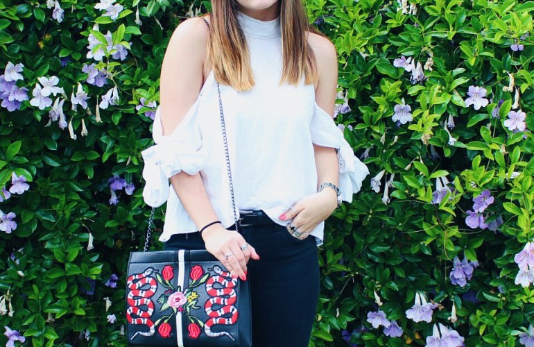 I am loving the spring and summer trends that I am seeing this year! Two trends that are here to stay: embroidery and exposed shoulder! This bag was calling my name. It is the perfect size and exactly my style. It is easily transitional through all the seasons, even if it is black. So, it is the perfect bag for me! Exposed shoulder includes cold shoulder or off-the-shoulder tops. This top is also great because it is almost in between the two, and I’ve worn it so much already. It is meant to be a little wrinkled, so minimal steaming is required. I don’t really buy anything that requires a lot of steaming or ironing, as I would much rather spend money on pieces that are easy to throw on. This is a unique cold shoulder top because it just loosely ties around the arm. It looks put together but effortless at the same time. It looks great with ripped mom-jeans as well! I just kept the bottom simple with black skinny jeans and black platform boots. I love incorporating edgy pieces with more feminine pieces, especially for spring and summer! I hope you guys enjoyed! Life has been a bit crazy- finishing up this semester with 7 classes, tax season, work, planning to buy a car…