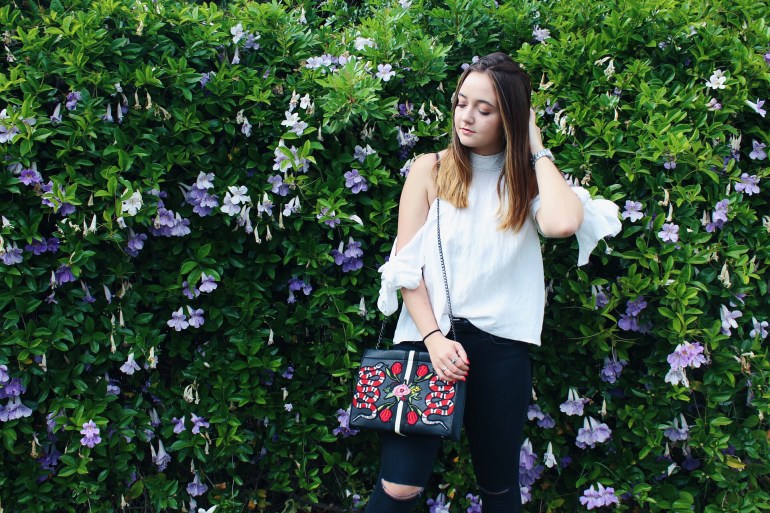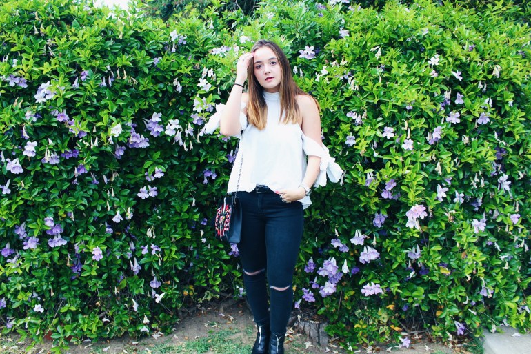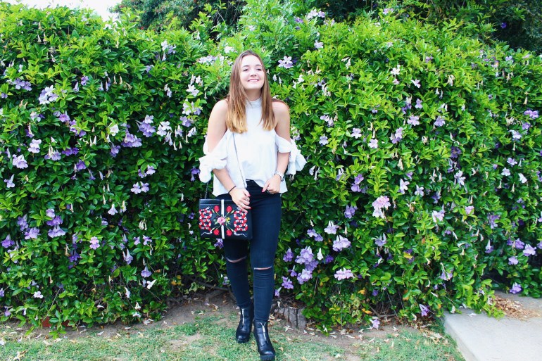 I am loving the spring and summer trends that I am seeing this year! Two trends that are here to stay: embroidery and exposed shoulder! This bag was calling my name. It is the perfect size and exactly my style. It is easily transitional through all the seasons, even if it is black. So, it is the perfect bag for me! Exposed shoulder includes cold shoulder or off-the-shoulder tops. This top is also great because it is almost in between the two, and I’ve worn it so much already. It is meant to be a little wrinkled, so minimal steaming is required. I don’t really buy anything that requires a lot of steaming or ironing, as I would much rather spend money on pieces that are easy to throw on. This is a unique cold shoulder top because it just loosely ties around the arm. It looks put together but effortless at the same time. It looks great with ripped mom-jeans as well! I just kept the bottom simple with black skinny jeans and black platform boots. I love incorporating edgy pieces with more feminine pieces, especially for spring and summer! I hope you guys enjoyed! Life has been a bit crazy- finishing up this semester with 7 classes, tax season, work, planning to buy a car…