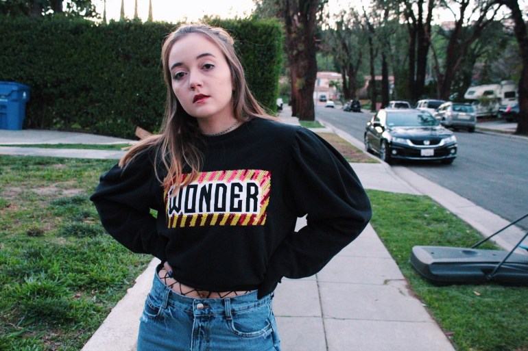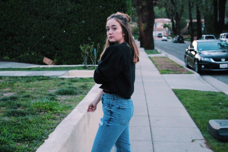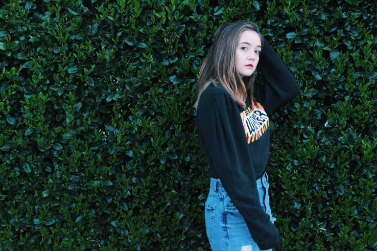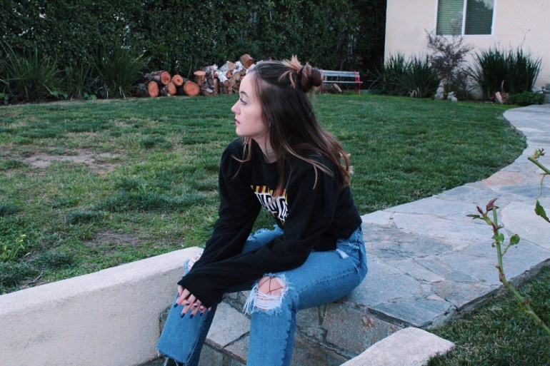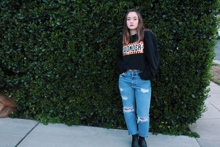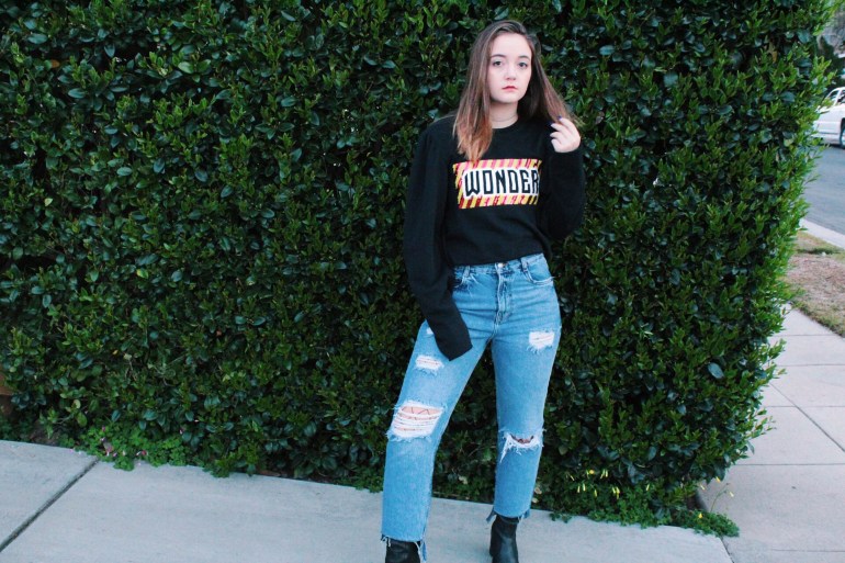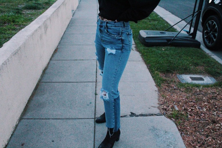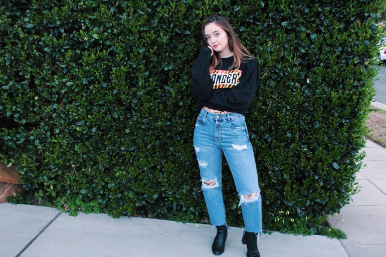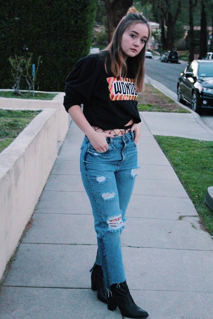 Anyway, I’m done ranting about that. This outfit is exactly what I’ve been going for lately. I love being different, and this top is definitely different. Loud colors and graphics are a huge spring trend, as well as a flattering dramatic sleeve. This top has raw edges, which is helpful since I might crop it a bit more. I struck gold when I found these jeans! It is so hard for me to find jeans since my leg/hip and waist ratio are all out of whack haha. I absolutely love the fit and the discoloration at the bottom! I tend to prefer straight or flare pants with a higher ankle boot, so I broke out these trusty ones from JustFab. I’m always looking for ways to add unique little details to my outfits, so I through on a pair of fishnets to peek through the top and rips of the jeans.